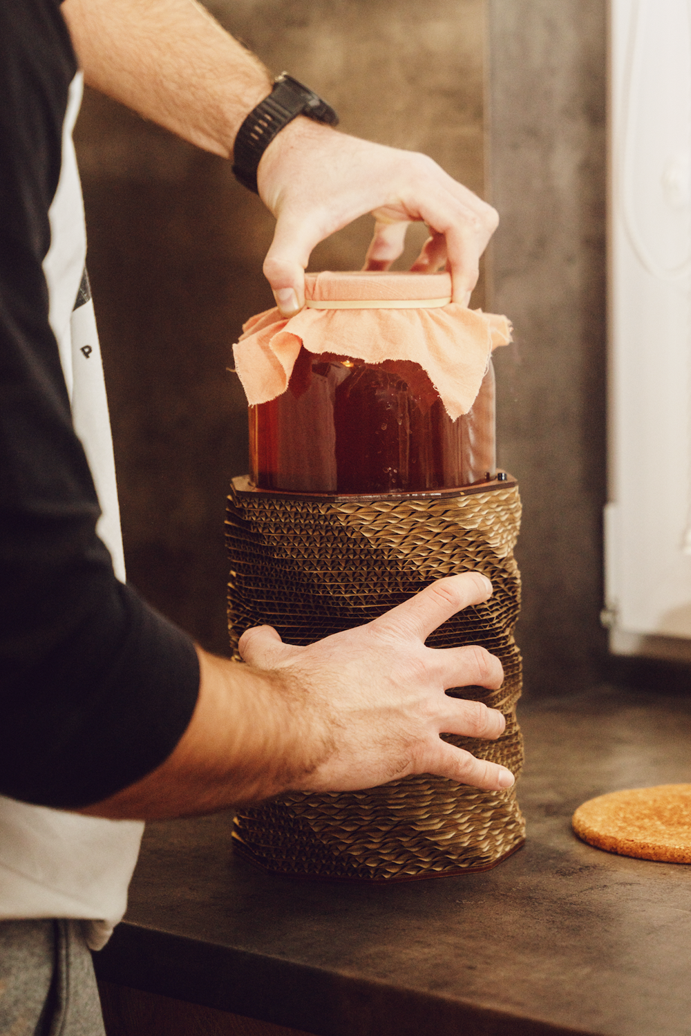 „Cílem bylo vytvořit fermentační kit, který se uživatel nebude snažit schovávat, ale naopak jej rád vystaví třeba na polici nebo do kuchyně,“ říká Ďuriník. Designérky Barbora Mrázková a Markéta Drábková ze studia Kartoons zareagovaly navržením elegantního válcovitého tvaru s otočnou konstrukcí, která umožňuje jednoduchou regulaci světla. Změnou úhlu natočení si uživatel volí, kolik světla k fermentu dopadá. Průsvitný obal navíc umožňuje sledovat proces fermentace, což je nejen praktické, ale i esteticky působivé. „Celý proces je najednou vidět, je to jako socha v prostoru. A funguje i bez elektřiny,“ vysvětluje zakladatel značky.