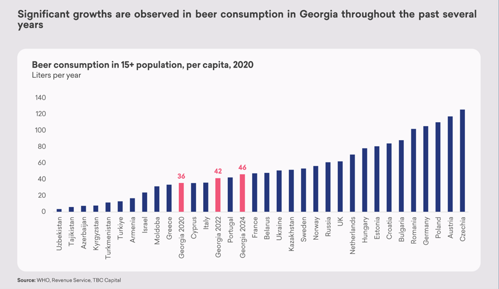 Jedná se o téměř 30 % navýšení oproti roku 2020 a Gruzie se tímto dostala ve spotřebě zlatavého moku na obyvatele před státy jako třeba Portugalsko, Itálie, Řecko, Moldavsko, sousední Arménie nebo Ázerbájdžán. Gruzie však stále znatelně zaostává za pivními lídry – Českem, Německem, Polskem a Rakouskem, kde se na osobu ročně vypije více než 100 litrů piva.